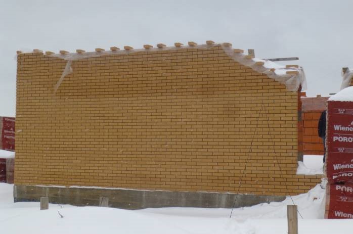 1) Наружные и внутренние стены выполнены из керамических щелевых камней размером 440×250×219 мм. На цементно-песчаном растворе методом прерывистого шва.